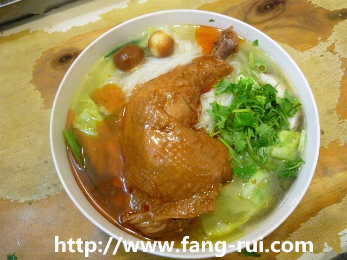 4、撈出米線,可以用涼水過一下,澆上雞湯汁,小蔥香菜切好,放入碗中,一碗香噴噴的雞湯米線就這樣可以享用了!